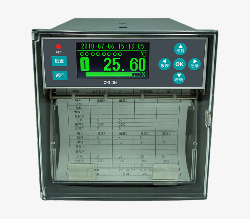 CHR12R系列有紙記錄儀畫面信息豐富,可同時顯示時間、數(shù)據(jù)、棒圖、報警等,支持定點和循環(huán)顯示,最多12通道萬能輸入,可輸入電流、電壓、熱電偶和熱電阻等多種輸入信號。